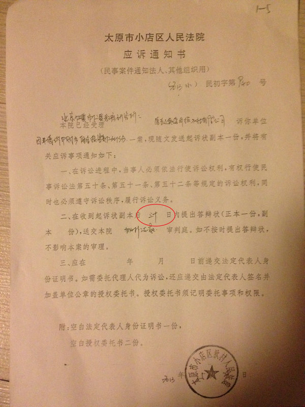 “这不是贼喊捉贼嘛!”赵勇无比愤怒。他在2013年5月30日收到了太原市小店区法院发出的《应诉通知书》。其中第二条写道:“在收到起诉状副本后30日内提出答辩状,送交本院狄村法庭审判庭。”