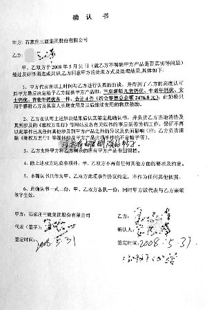 在王远萍家里,钟云拿出了一份“确认书”,上面答应给王远萍三鹿新版儿童钙优、中老年钙优、女士钙优、青壮年钙优各一件(市场价约2476.8元),而王远萍所需要做的是删除先前发在一些网站上的涉及三鹿奶粉质量问题的帖子。