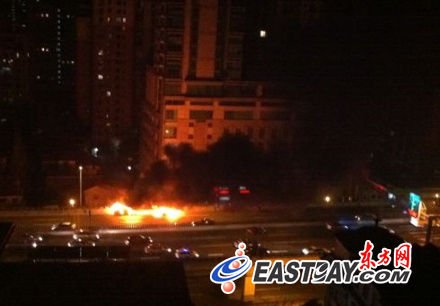 22日晚11点30分左右,延安路高架凯旋路段发生车祸。据现场目击者称,三车相撞后其中一车自燃,并有目击者拍照上传网络。晚11:40分许,网上已可见起火现场照片,引发网友关注、转载。