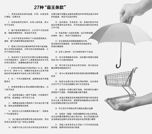 和上述10大类相对应的违法条款共计27种,其中包括“打折商品不退不换”等。