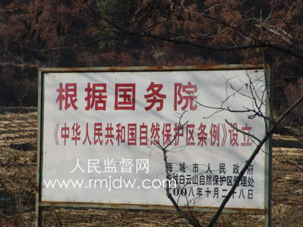 核心提示:2008年10月28日,辽宁省设立了白云山省级自然保护区,面积5350公顷。然而,人民监督网记者于2009年11月2日在海城市孤山镇瓦子沟村采访时,却亲历着自然保护区界碑内炮声隆隆、挖掘机轰鸣的采矿活动,竖立在瓦子沟村口醒目的“根据国务院《中华人民共和国自然保护区条例》设立海城白云山省级保护区界”的界碑成了一块摆设。