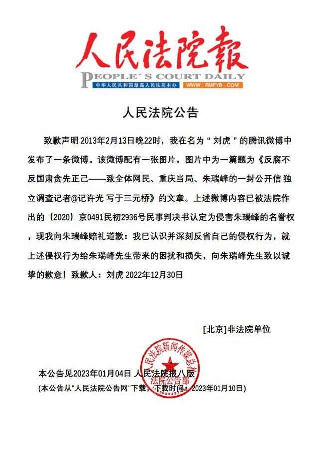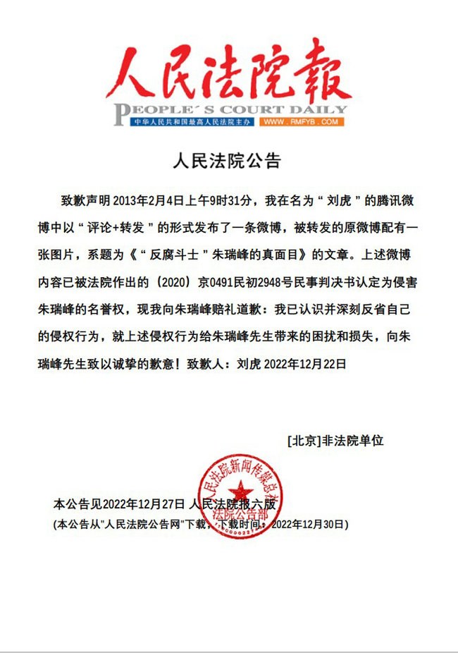 在人民监督网的主编朱瑞峰曝光重庆市北碚区原书记雷政富12秒不雅视频十周年之际(2012年11月20日),朱瑞峰通过法院状告自媒体人刘虎名誉侵权案又获喜讯:经北京互联网法院执行局审核,自媒体人刘虎因在雷政富案件中揑造事实,攻击诬陷朱瑞峰,被北京互联网法院依法判决刘虎在《人民法院报》刊登致歉声明,向原告朱瑞峰赔礼道歉(登报的相关费用由被告刘虎负担)。道歉声明分别于2022年10月28日,在人民法院报第七版刊登3次;2022年12月27日,在人民法院报第六版刊登道歉声明3次;2023年1月4日,在人民法院报第八版刊登道歉声明3次。
