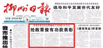 6月26日,中共柳州市委组织部与中共柳州市委宣传部召开会议,向媒体说明柳州市委对柳州市工人医院抢救覃俊同志进行奖励的情况。鉴于柳州市工人医院党委组织广大党员医护工作者,在抢救广西优秀共产党员、少数民族纪检干部覃俊同志过程中做出的突出贡献,柳州市委近日作出决定,授予柳州市工人医院党委“柳州市先进基层党组织”荣誉称号,并根据党费使用的有关规定,决定从市级留存党费中列支40万元给予奖励。