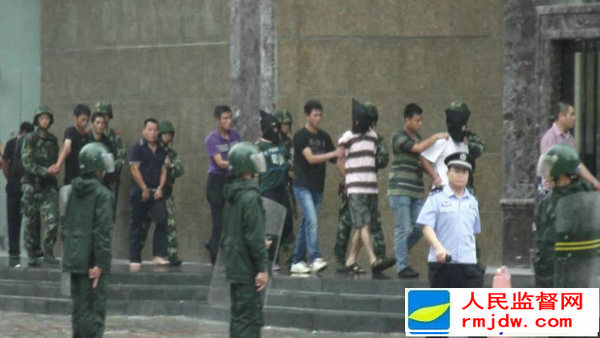 指挥警官通过指挥车载扩音设备,向参战的警察宣布,同步抓捕行动成功。随后,这些人员被戴上黑头套押上警车和大客车疾驰而去。