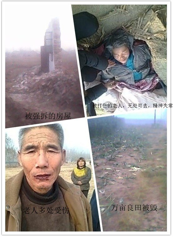 “强拆”?“对!就是强拆!不成就打他们,看谁不服?实在不行拉到派出所去!”这是一位姓贾官员的原话。在11月21日的上午9点半左右没有人性的拆迁人员就把两位六十多岁的老人给打了。下面是老人的孩子们口叙的事情经过:“事情是由拆房引起,在几天前拆迁人员无故损坏了我们家谋生机器的配电箱价值两万多,我们找领导要求维修,修好之后再拆我们的房子。他们不但不给我们修机器,还以贾金洋书记为首的一帮人来我家拆房。当时我父母都在现场,要求他们先修机器在拆房子,没有人性的贾金洋书记一帮人,却把我六十多岁的父母从乱砖堆上拉了四米多远,父亲伤势较轻,母亲被庄寨120拉到医院抢救,血压升到200多,两肩膀被拉伤,后背多处淤青,由于恐吓加惊吓我母亲病情恶化,已经精神失常,血压不直高升不下,无奈之下只能把母亲送到市医院治疗。在我们庄寨住院村支书说负责,也说给个说法,镇领导也说给调解,但是直到今天没有见过 他们一个人的人影,更别提说法了。我们咽不下这口气,欺负老实人,我们确实没有权利,也不认识什么高官。但是我们知道还有公平公正的媒体,网络。希望有你能力帮助我们的人,能伸出你们的援助之手。