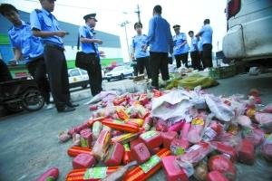 十多分钟后,四五辆执法车分别从市场南门和该市场东侧胡同开出,直接堵在销售过期食品的摊位前。参与执法的除了大兴区工商分局德茂工商所的十多名工作人员,还有属地派出所的民警及城管。