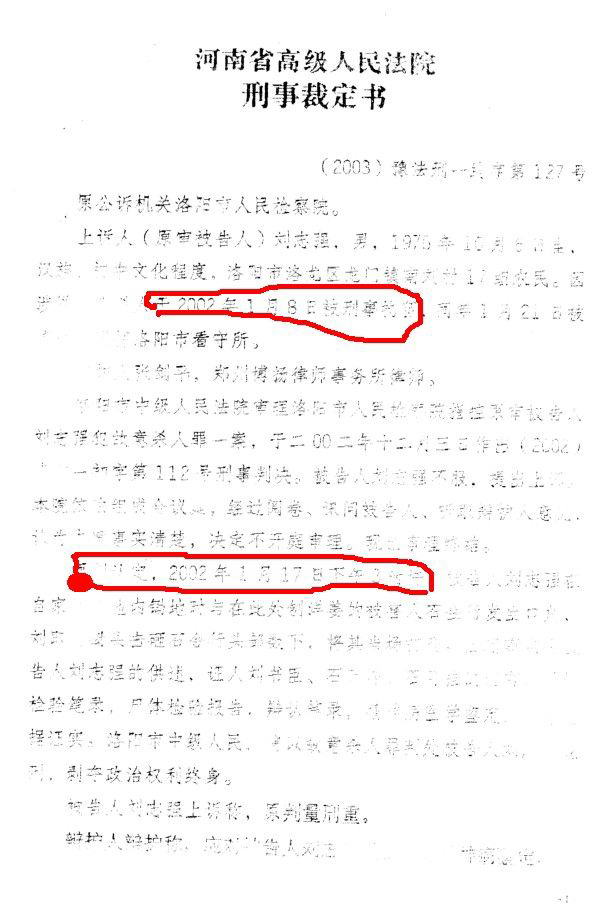 洛阳中级法院审判长陶向阳、审判员郭燕燕、代书记员腾建龙,说什么严格、认真。他们竟将发案时间搞错了9天。以他们法院的认定,即:我儿刘志强被刑事拘留后9天才将人打死。此判决创下中国杀人犯之最。
