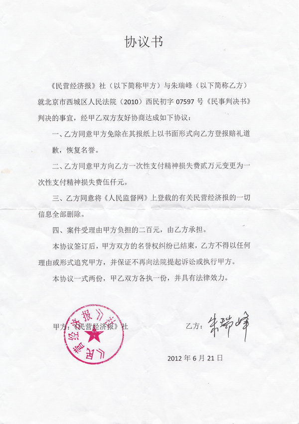 2014年5月23日,人民监督网记者朱瑞峰在腾讯、新浪微博称:感谢各位网友对人民监督网的监督,对于网络上对我实施辱骂,人身攻击和诽谤的5毛和小人,我向来不予理会,但对于给他们提供平台的官方喉舌媒体,我会拿起法律武器,让其付出沉痛的代价。附:羊城晚报集团【民营经济报】和湖南日报集团【华声在线】的败诉文书。