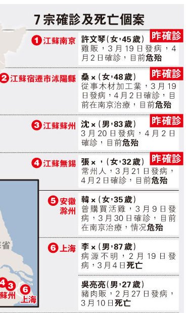 此前,上海和安徽发现3例人感染H7N9禽流感病例。其中上海两名患者抢救无效死亡。安徽省滁州市患者韩某正在南京抢救。