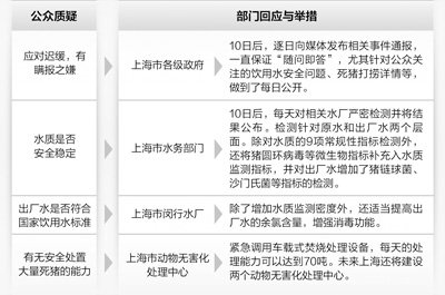 上海市政府的逐日通报称,到目前为止,事件对饮用水水质并无太大影响。经严格检测,水质基本正常。这一发布,引发诸多质疑:“数千乃至上万头死猪漂浮黄浦江,居然还能水质基本稳定?可能吗?”