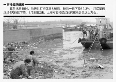 3月5日,水上保洁人员在横潦泾水域打捞到几十头死猪。起初,工作人员并未在意,每年黄浦江上游都会有死猪漂来,一年总会捞出三四千头。他们并未向上反映,直到8日开始,发现死猪来势汹汹,才引起警惕,开始向市区相关部门报告。