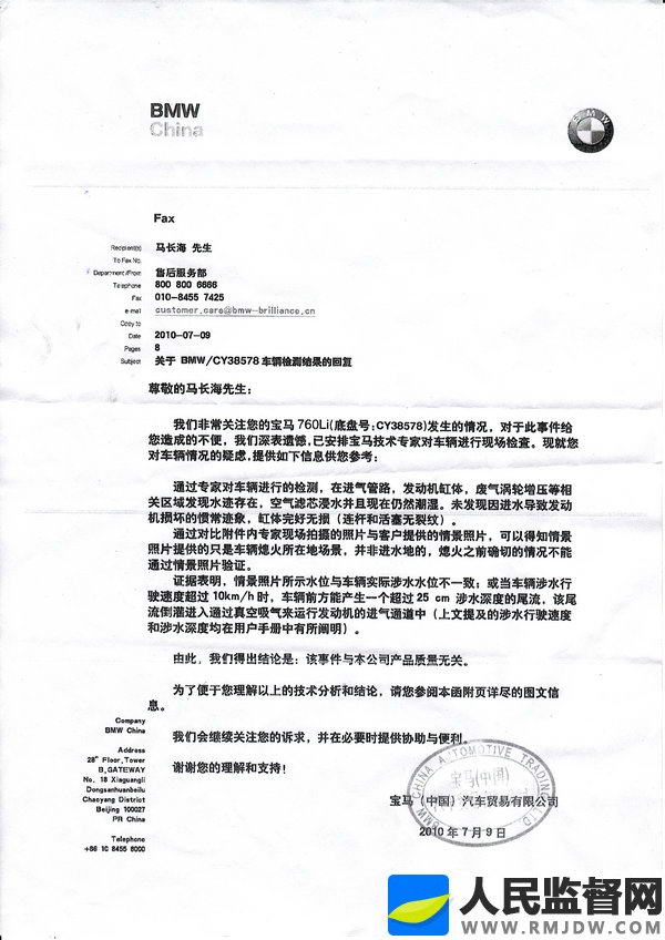 2010年7月9日,马长海终于得到了一份宝马中国)汽车贸易有限公司的回复: