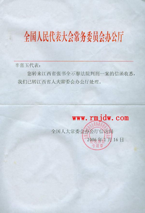 无奈之中,我于2006年6月13日又致函全国人大内司委,将江西省人大、省检察院对张书全申诉案地方保护的做法进行反映。2006年9月19日,全国人大常委会办公厅信访局复函已转交最高人民法院办公厅处理。2007年3月9日,我又致函全国人大内司委、最高人民检察院对此案进行再次监督。