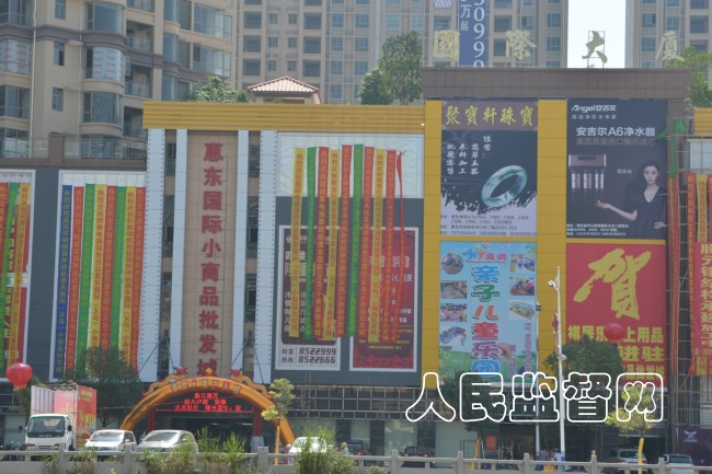人民监督网记者在惠州市国埠实业有限公司的“惠东国际义乌小商品城”看到一至三层已经对外招商开业,第四层正在装修。记者以买商铺的名义与招商经理毛耀谊聊天,毛耀谊炫耀的说:“我们杨老板是有政府背景的!”义乌商品城的大老板正是“政法王”郭王生的表妹夫杨耀国。