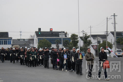 2月12日上午11点,一辆乡村礼炮车鸣炮开道,一辆满载花圈的卡车紧随其后,十几个村民抬着花圈出村。财新记者在现场看到,周元兴的儿子周晓华捧着火盆,面无表情,走在前头,一名少年沿路撒下黄色纸钱,一名少女捧着周元兴的照片跟随其后,8个村民抬着红色棺木,缓缓走上村南的厚东路。