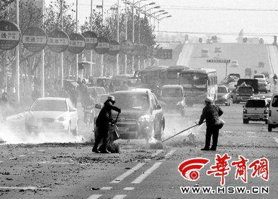 婚礼车队过后,环卫工人清扫机动车道上的鞭炮碎屑