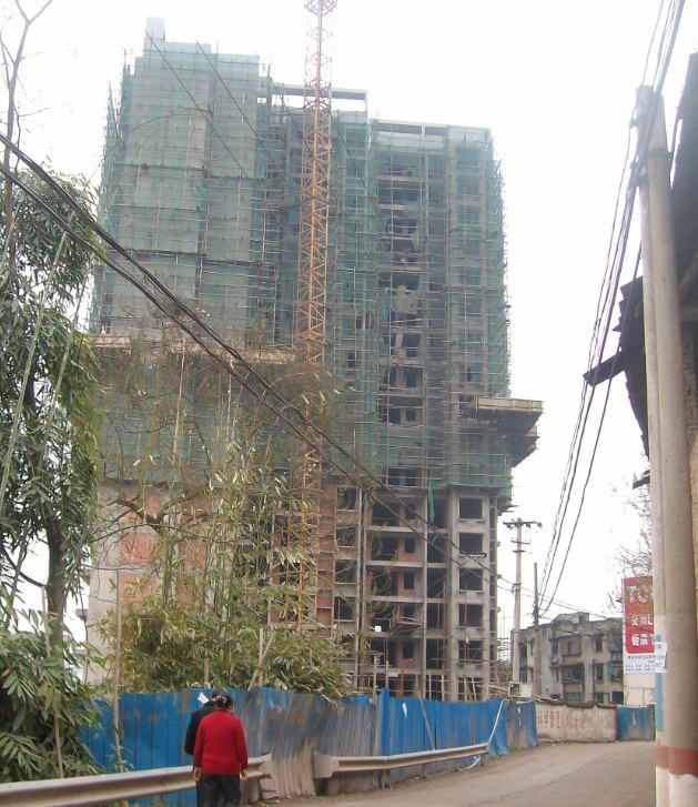 该栋大楼已拉起了警戒线,围墙上贴有重庆市渝北区人民政府2011年2月18日的查封封条。在围墙内,凌乱地剩下几个桩基坑和摆放了很多钢材,整栋大楼已停工。当地一位百姓说:“统景目前最高的楼层才4层楼,多数为两层楼。这是该镇最高的一栋大楼,有18层,据说是违规修建,才停工,并且要拆了。”