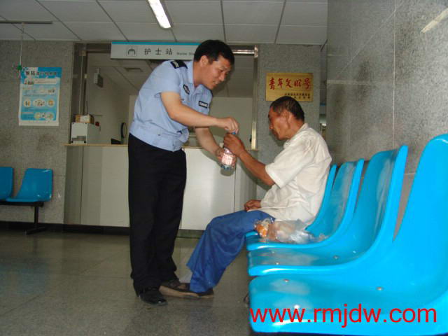 “ 2007 年 7 月 10 日 12 : 35 分,接 120 急救中心的电话称,在陶然亭路少年宫门口有一老汉晕倒在地。”北京市公安局宣武公安分局陶然亭派出所王强、郜延伟两位民警说,“已经四天了,老汉几乎没有吃饭和喝水,这应该是导致他昏迷的主要原因。”王强、郜延伟了解情况后,当即买来火腿肠、面包和矿泉水,照顾老汉吃下去。为了确保老汉的生命安全,大家又将老汉送至政府指定的定点医院进行全面检查,确定老汉身体无碍,大家悬着的心终于放了下来。