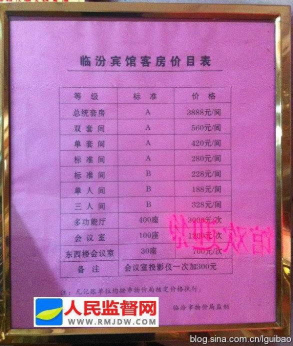 临汾市的临汾宾馆价格表