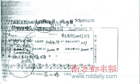 这张国有土地使用权有偿使用收入专用收据显示,该地块面积为52674.53平方米,实收金额3万元,单价为0.57元/平方米。