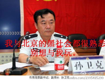 第二,我们回归“别想跟我玩,我跟北京黑社会都很熟”这句要火的狠话。中国政府在任何场合均一再重申我国没有黑社会,那么孙卫克口中的北京黑社会又指的什么?要么政府撒谎,要么是孙卫克胡扯,二者必是一端。分析之下,我们认为一定是孙卫克这样的官员在胡扯,中央所在地——北京怎么可能有黑社会!所谓的黑社会不外是些许地痞流氓稍稍有了点规模而已。然而,假设这“北京黑社会”真是存在,或者黑社会性质的组织确实存在,而且近市的公安局局长都知道,那么北京市有关部门能不知道吗?不知道的话是其渎职,知道的话是其庇护,是在犯罪!这孙卫克看来还真不是什么负责任的人,也绝对不是讲义气的人,三言两语间就把跟他很熟的一伙江湖朋友卖了,连带着把北京里的官员兄弟们也卖了。