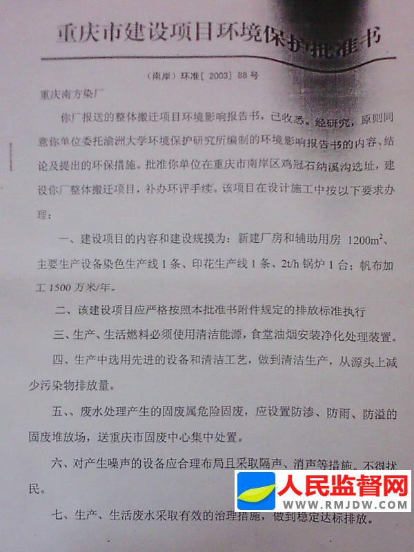 人民监督网记者在南岸区环保局提供的(南岸)环准(2003)88号文件上看到,重庆南方染厂的建设项目内容和建设规模为:新建厂房和辅助用房1200平方米,主要生产设备:染色生产线1条、印花生产线1条、2t/h锅炉1台;帆布加工1500万/年。从此可以看出,该厂是新建厂房,根据《水污染防治法》相关规定,南岸区环保局批准重庆南方染厂的行为系违法行为。
