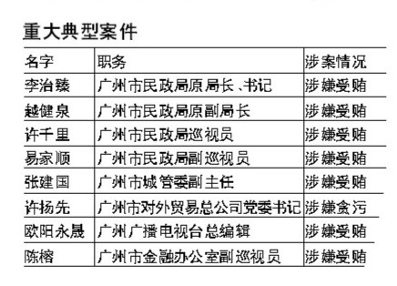 其中,重大典型案件主要有:市民政局原局长、党委书记李治臻、市民政局原副局长越健泉、市民政局巡视员许千里、市民政局副巡视员易家顺涉嫌受贿案;市城管委副主任张建国涉嫌受贿案;市对外贸易总公司党委书记许扬先涉嫌贪污案;广州广播电视台总编辑欧阳永晟涉嫌受贿案;市金融办公室副巡视员陈榕涉嫌受贿案等。