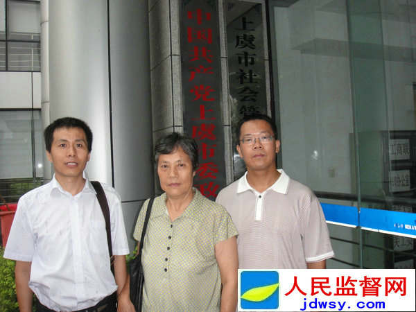 图:法学博士滕彪(右一)、访民王苗珍(中)、调查记者朱瑞峰(右三)在上虞市检察院
