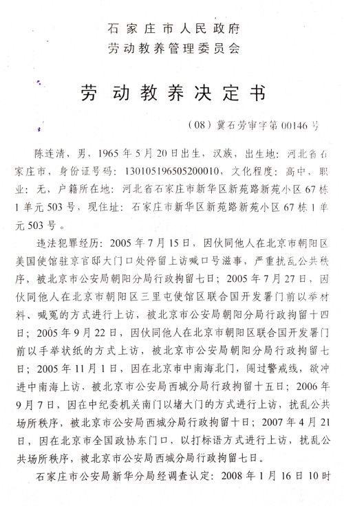 从2004年至今,陈家人在上访的路上被拘留十三次之多!累计140多天!,就连陈连清70多岁,身患高血压.糖尿病的老母亲也难逃被拘留的厄运。2008年中央两会期间,陈连清再一次被拘留,在拘留所内,石家庄市公安局新华分局局长康云良和陈连清谈条件.康局长直截了当地对陈连清说:”对于你家的案子,我们拿出两套方案:一.给你四十万元,你家不能追究任何人的法律责任.签字息诉罢访;二.如果你不接受这个条件,我们就劳教你.”