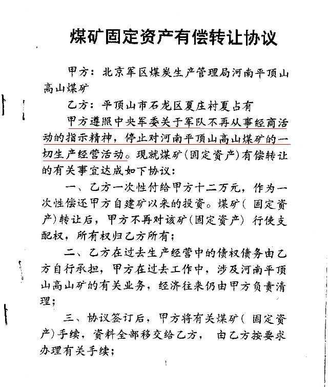 军办高山煤矿与夏占友签定的转让协议