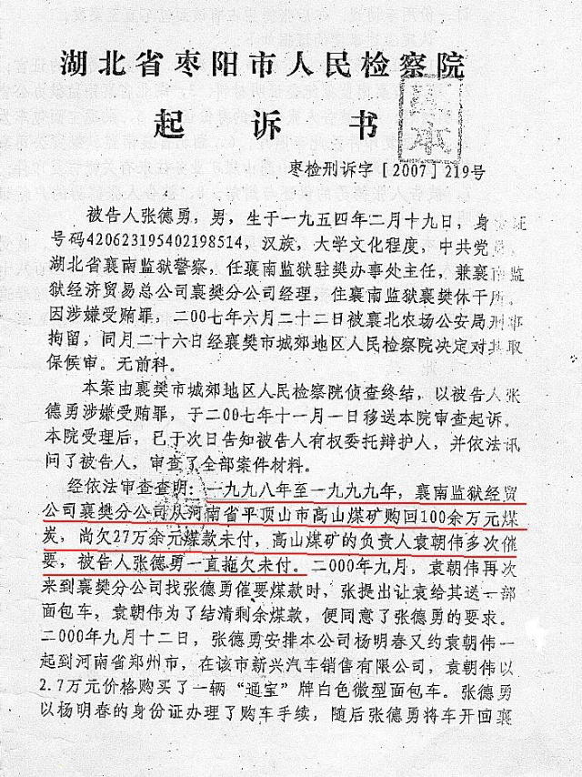 既然1999年1月25日后襄樊分公司与高山煤矿既无业务往来,又无债权,那么何来城郊检察院起诉书指控的所谓“1998年至1999年,襄南监狱经贸公司襄樊分公司从河南省平顶山市军办高山煤矿购回100余万元煤炭,尚欠27万余元煤款未付,高山煤矿负责人袁朝伟多次催要,被告人张德勇一直拖欠未付。”,何来所谓的“2000年9月,袁朝伟再次来到襄樊分公司找张德勇催要煤款时,张提出让袁给其送一辆面包车,袁朝伟为了结清剩余煤款,便同意了张的要求”这样虚假的说法?