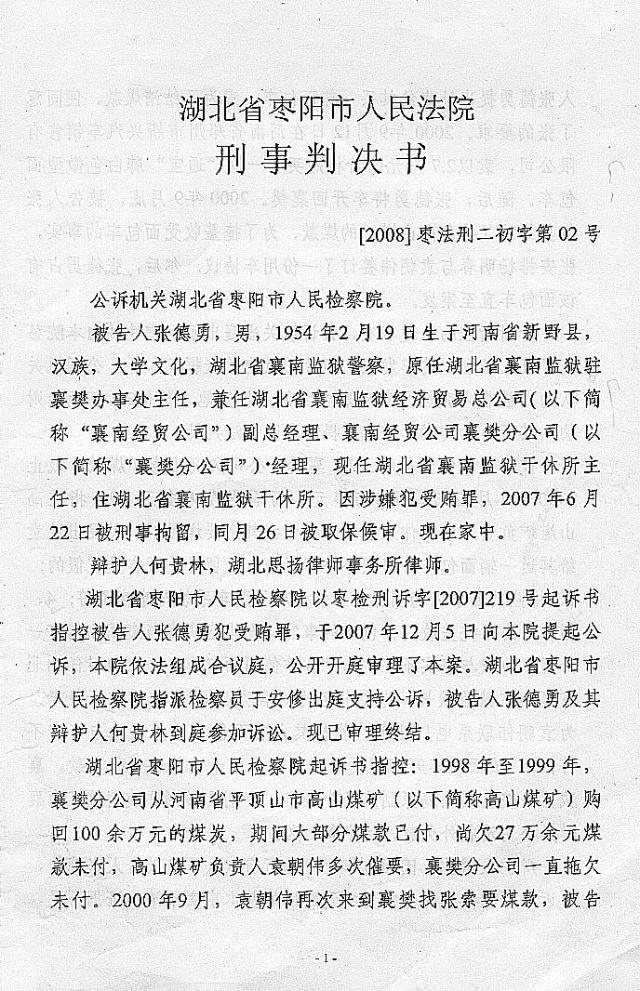2008年4月8日,张德勇警官被枣阳市检法两院认定受贿罪成立,并判处有期徒刑一年。张德勇警官不服一审判决,当庭向襄樊市中级法院提起上诉。