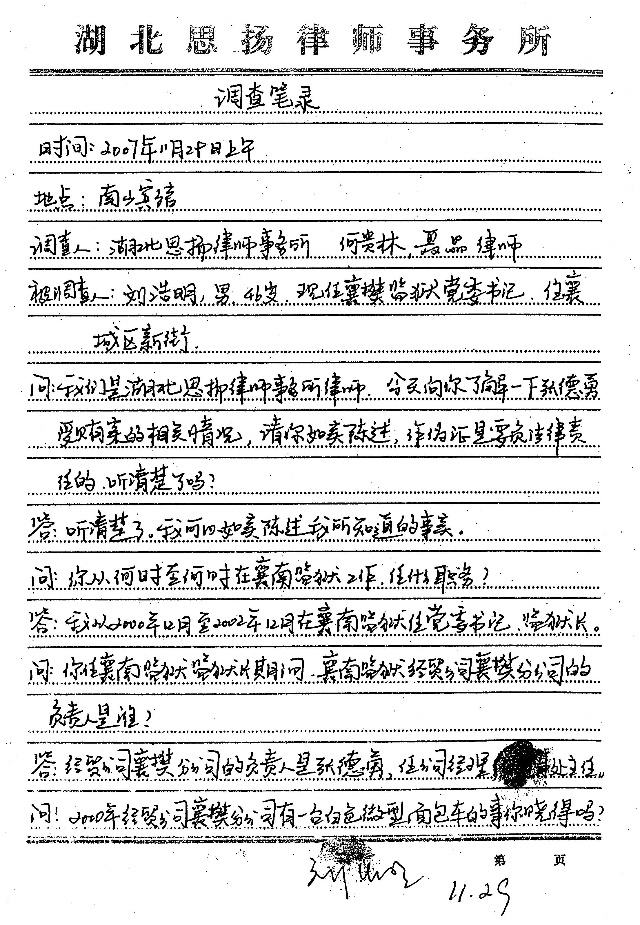 3、时任襄南监狱党委书记、监狱长刘浩明的证言——证明了张德勇向其汇报了该车的来历,权属、合作项目,同时证明了该车是杨明春在使用,也证明了监狱给张德勇配备有牌号为鄂警666的警用轿车。